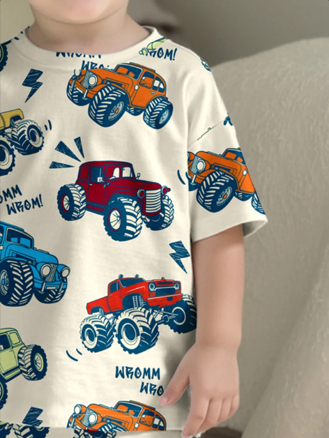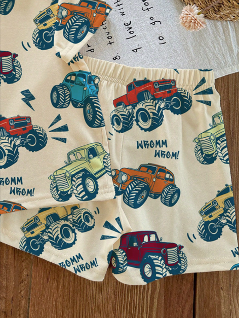 SHEIN طقم قميص وسروال قصير كاجوال فضفاض مطبوع برسوم شاحنة دفع رباعي لطفل/طفل صغير ، مجموعة من قطعتين للصيف